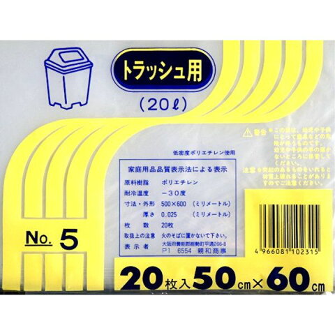 □サイズ・外形600×500mm/厚さ0.025mm□容量・20L□色・透明□耐冷温度・マイナス30度□原料樹脂・ポリエチレン□品名・ポリ製 エチケット袋 No.5 トラッシュ用□用途・袋 ビニール袋 ゴミ袋□キーワード・ふくろ ぽりぶくろ とうめい ごみぶくろ びにーるぶくろ□メーカー名・親和商事□カテゴリ・S270009□入数・20枚